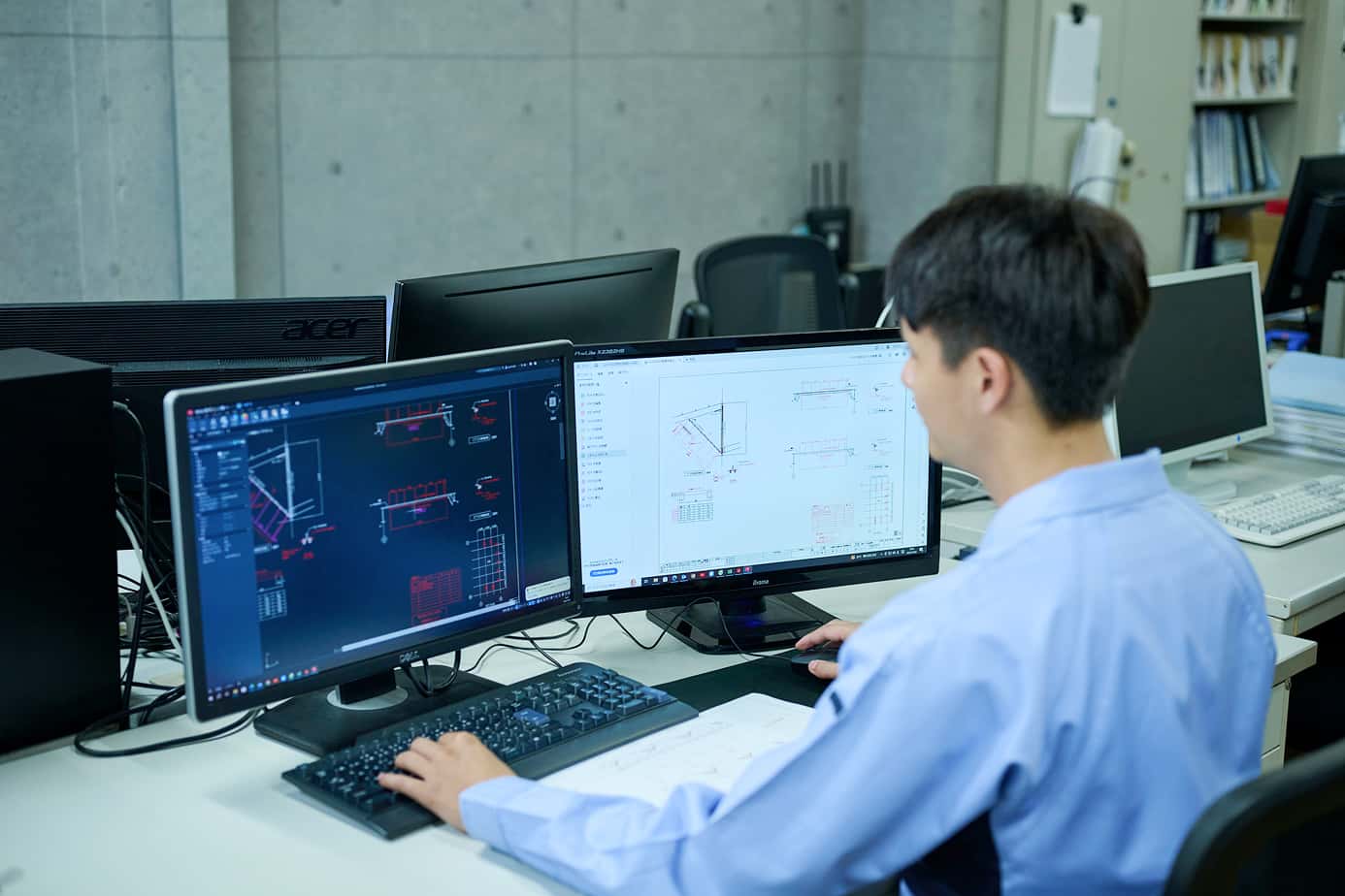 その2週間後。PC内の3D図面データを私に見せながら、エンジニアはうれしそうな声で「できました」と言いました。図面を見せられた私は驚きました。私が描いて見せたイメージのほとんどその通りに綺麗に仕上がっていたのです。ここまでできるとは正直思っていなかったのですが、それを見た瞬間、「これだけではもったいない」という気持ちが湧き上がりました。自社の業務に展開できると直感的に思ったのです。まず、弊社で請け負う取付部材製作に関連して、耐震補強のシミュレーションが可能になります。そのほかにもあれもこれもできる、と頭の中にイメージが広がり、それまでの海部架設工業とは違った業態ができることを確信しました。